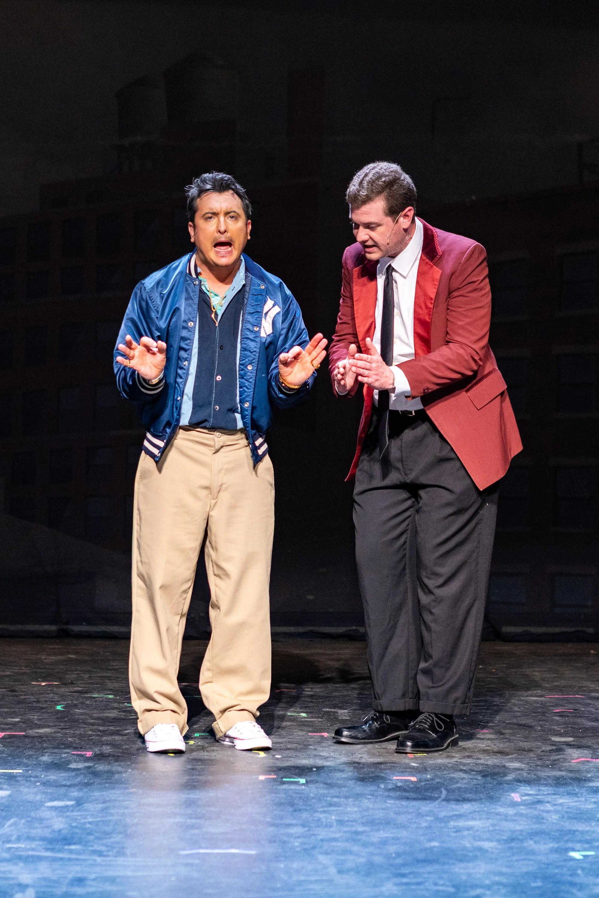 John Mazzarella, Mike Fales.Photo Credit: Janette PellegriniAnd his performance was well worth the wait. Fales was captivating as he narrated his bits of the story and brought tremendous presence and light every time he stepped forward. An excellent return to the stage, I must say! Bruce Konopa's portrayal of Nick Massi rounds out the Four Seasons nicely. Konopa did a fantastic job showing us how Nick prioritized the music over anything, while keeping the group vocals harmonious. Thankfully, the ensemble has just as much talent as the four leading men! "Jersey Boys" isn't just a boys club and the females do more than hold their own. "My Boyfriend's Back" is a recognizable favorite and Sarah Minto, Shea McMahon, and Dea Ahlgrim do it justice. You will also find them playing various roles throughout the show as well, doubling as parents and girlfriends and it's always great to see talent that isn't one-sided. I was also impressed with John Mazzarella who played Joe Pesci, among other characters. His ability to hop between different accents, mannerisms, and costumes without missing a beat has really become the foundation for cementing himself as a true, bonafide character actor.