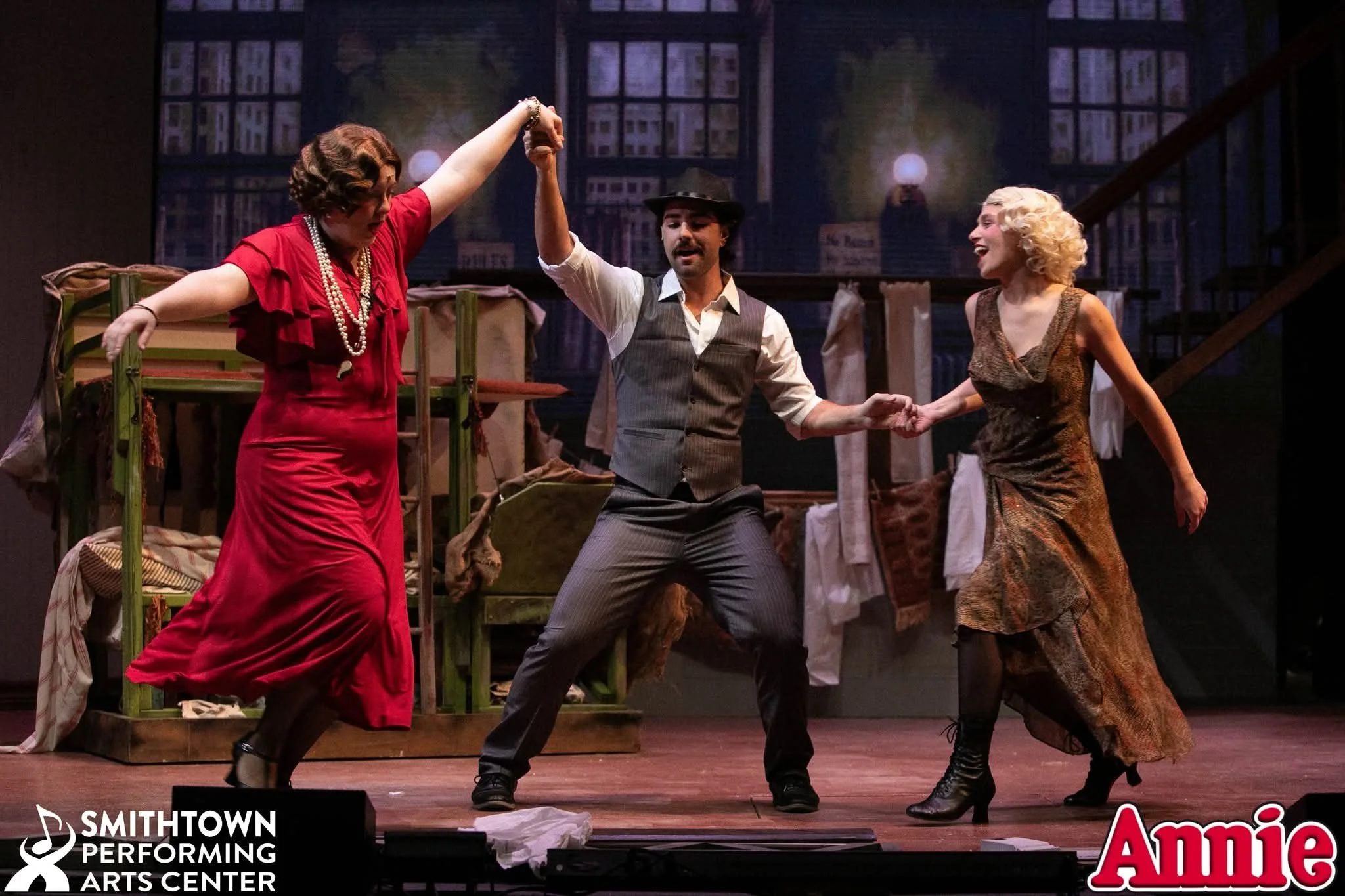 Andrew Lenahan, Briahna Gribben, Marilyn Parada.Playing musical theater's favorite antagonist was Katy Trunz, in the role of Miss Hannigan. This deserves another WOW! Trunz presented a more polished Hannigan than I am used to, which was a nice change while also delivering some of the most perfect vocals for the character as well. I promise you have not heard "Little Girls" sung the way she did it and I loved.every.minute. I wish there was a recording so I could revisit it! Truly outstanding. Michael Shapiro and Julie Stewart play Rooster and Lily and were great fun too. Shapiro has always been highly regarded as a strong dancer and his attention to detail with the choreography in "Easy Street" did not go unnoticed; you don't often see that with Rooster, and it was nice to see. Matthew Surico returns to the Smithtown stage as well in the role of Bert Healy while also doubling in the ensemble and I cannot say enough good things about him. Yes, of course his rendition of "You're Never Fully Dressed Without a Smile" will having you smiling and humming the tune on your way out, but his ensemble work is something *else* to pay attention to. His facial expressions and energy with group choreography is F-U-N to watch and makes what should be background moments wildly enjoyable. Keep an eye on him! Rounding out the adults is Michael Sherwood as Roosevelt (who has a memorable part in Act 2's "Tomorrow Reprise") and Dan Schindlar as Drake, but I have to give another special shout out to Will Brennan as Bundles, whose presence brightens every stage!